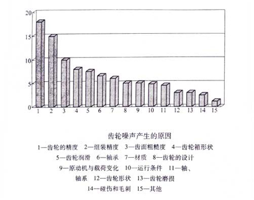 3.齿轮噪声的特点 齿轮在运转过程中,由于受到节线冲力和啮合冲力的激励,一方面产生频率为啮合频率和它的高次谐振的受迫振动,另方面产生频率为固有频率的瞬态自由振动。当啮合频率和固有频率互为整数倍时,可能产生强烈的共振。因此,齿轮噪声有两种形式:一种是以啮合频率振动的噪声,另一种是整个齿轮以其固有频率振动的噪声。以哪种形式为主,则取决于齿 轮的结构和精度、传递载荷等多方面的因素。齿轮频谱中各个频率的峰值,一般均随着齿轮转速的升高而加大。因为冲击力的数值取决于其随时间变化的规律,即力的变化时间越短,其数值越大。所以当齿轮转速升高时,激励力加大了,从而使振幅增大,引起辐射的噪声级升高。 齿轮噪声产生的原因,除了齿轮本身的原因之外,还有轴、轴承、箱体,以及驱动系统和工作机等方面的原因。以下图例齿轮噪声产生原因是根据调查资料绘制的。调查对象是汽车、机床、通用机械、减速器等动力传动齿轮装置,齿轮模数<=6mm,分度圆直径d<=400mm,齿轮精度相当于GB/T 10095-2001中的8级精度以上。