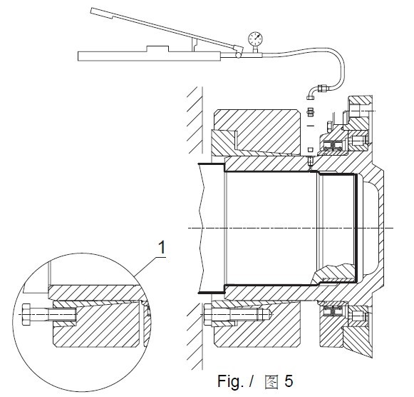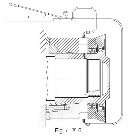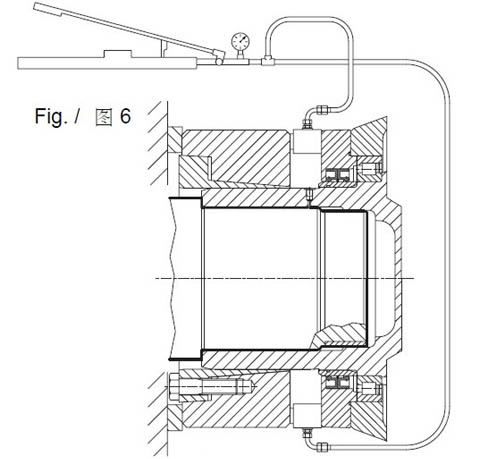 (3)如图5所示,轴向滑动接头,从而可从孔G1/8加入加压油(最大1000bar),以便于从机器轴上卸下行星减速机/行星齿轮减速器装置。如果在使用上述方法时,由于涨紧套不能确保耐压强度而无法释放行星减速机,可按照图6的方法进行操作,如果空间允许,可使用专用液压推进装置,在位于减速机封盖对称180度的位置各放置一个液压推进装置。 (4)如果是在开机运行过一段时间后拆卸齿轮装置,则需要将涨紧套从轴上卸下,并使锥形圈脱离,并清除安装表面上的所有残余污垢或铁锈。重新装配涨紧套前,请按装配方法来操作。